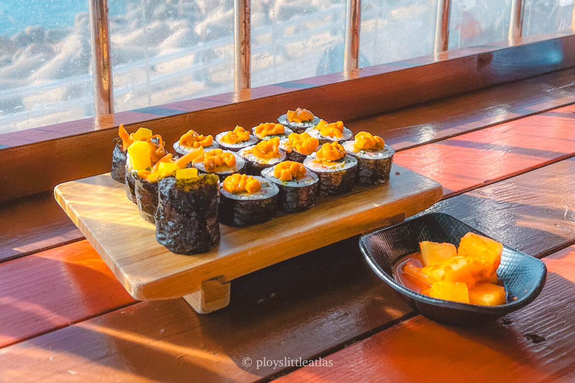 The plump rolls of kimbap, neatly wrapped in dark seaweed (gim), are practically hidden beneath a generous, rich, golden mound of fresh uni.