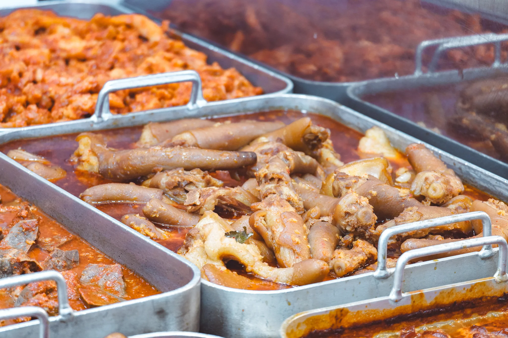 Dwaejikkolijjim, a dish of braised pig’s tail cooked with a blend of soy sauce, ginger, garlic, and rice wine, is a unique find in Korean cuisine. It’s not something you come across every day while traveling in Korea. However, thanks to the vibrant atmosphere of Gwangjang Market, you can easily discover and indulge in this daring drinking snack (안주). Alongside dwaejikkolijjim, you’ll find other braised delights that perfectly complement your alcoholic beverages. These include braised pork skin (돼지껍데기), chicken gizzard (닭모래집), beef lung (소 허파볶음), and pig leg (족발).