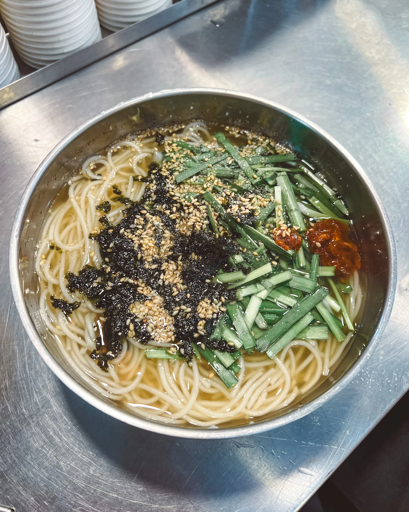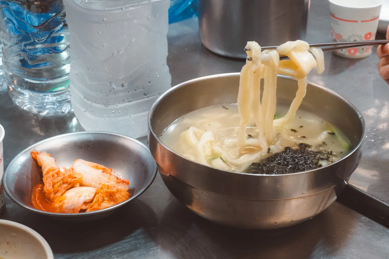 Kalguksu may ring a bell if you’ve watched the popular Netflix series “Street Food,” particularly the episode highlighting Seoul’s renowned Gwangjang Market. However, if you’re not familiar with it, let me introduce you to this delightful culinary creation. Kalguksu features handcrafted wheat flour noodles that are skillfully cut with a knife. Served in a generous bowl, these noodles are accompanied by a flavorful broth and an array of complementary ingredients.
