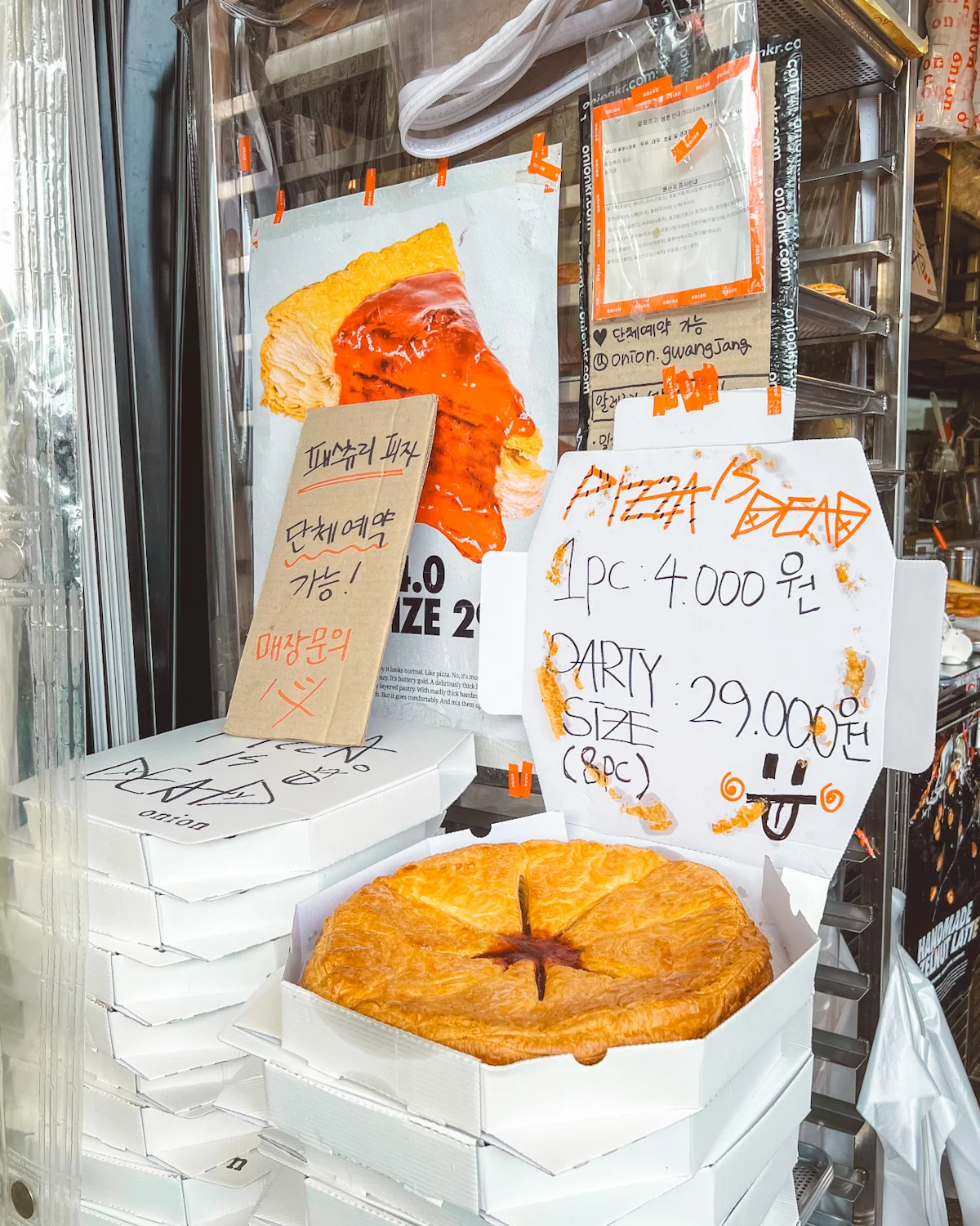 At the market’s South Gate 1, you can find another store of the famous Cafe Onion (카페 어니언). Unlike its well-known counterpart in Anguk, this branch boasts a completely distinct aesthetic. While the Anguk location showcases traditional Korean architecture, the Gwangjang outlet embraces the concept of a quaint, bygone-era house, perfectly complementing the market’s nostalgic ambiance. As you chance upon Cafe Onion’s Gwangjang Branch, be sure not to miss out on their signature offering – the Pastry Pizza. This delectable treat has captured the hearts of passersby, with its popularity evident as people pause to snag a bag or two!