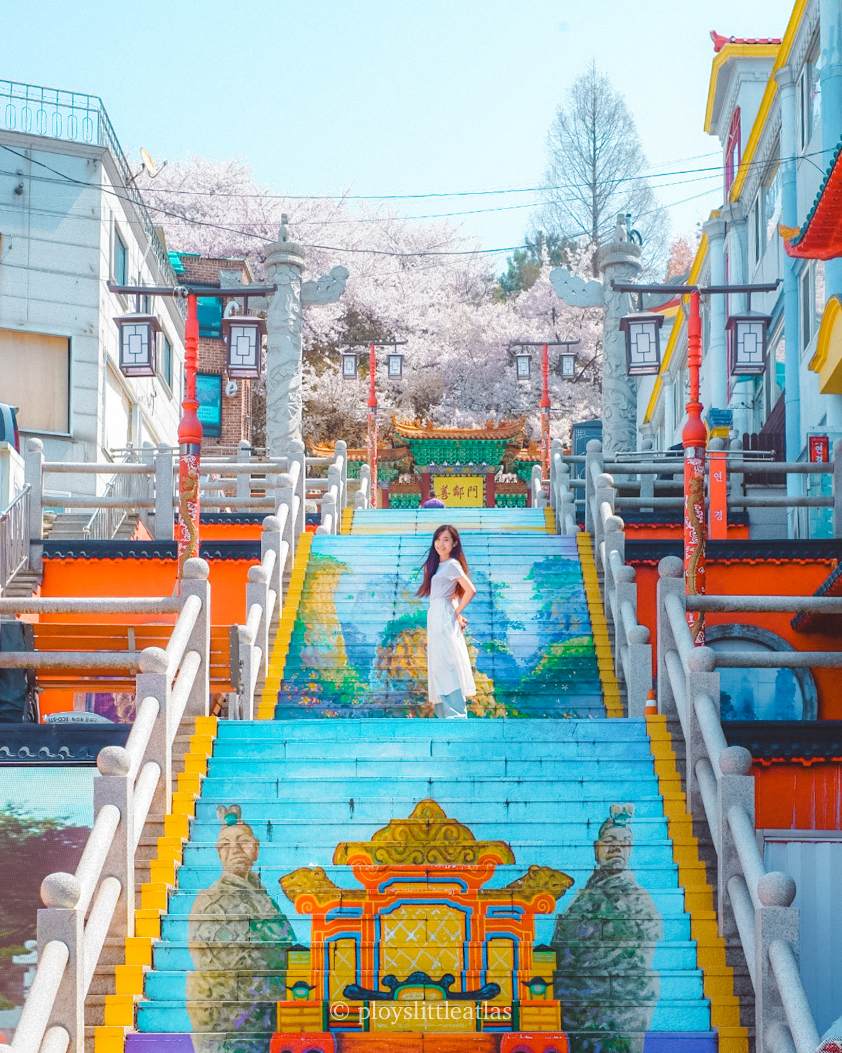 Start by wandering through the main Chinatown streets. The contrast of the traditional red and gold architecture against the soft pink petals is a photographer’s dream. Walk up the Cheongil Jogyeji Stairway—these stairs historically divided the Chinese and Japanese concessions. At the top, a statue of Confucius looks out over the harbor, surrounded by trees.