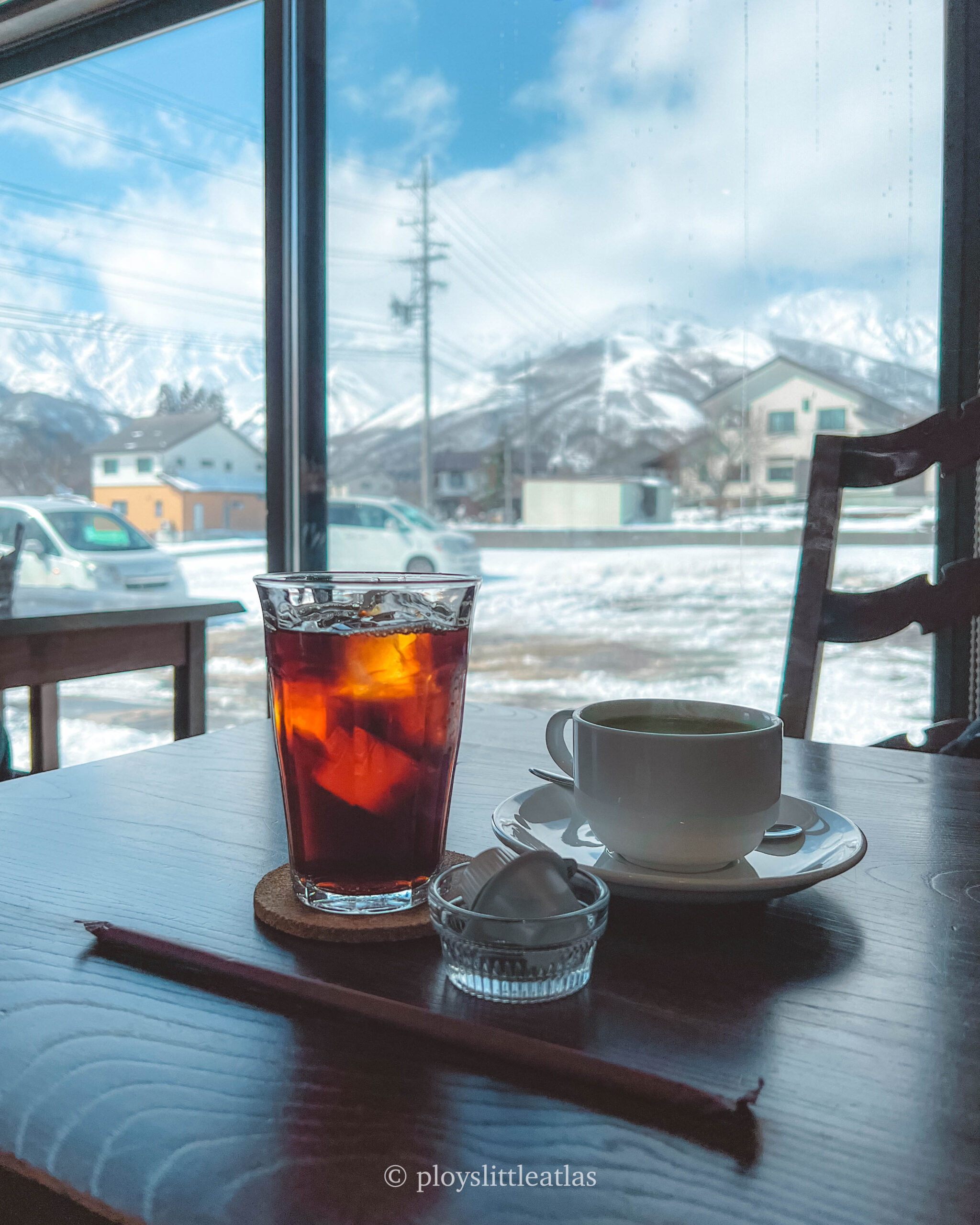 The vibe is distinctly quiet and reflective. Sitting at the counter or a small table by the window offers a direct, unobstructed view of the Hakuba mountains, making it an ideal spot for “mountain watching.” With just a few tables and a small wooden counter, the seating is intentionally intimate, offering a private and peaceful escape from the busier resort areas.