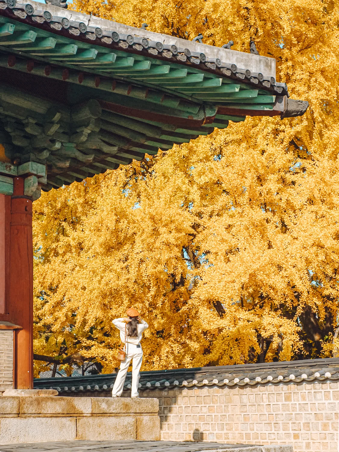 Spanning approximately 1.3 kilometers along the western walls of Gyeongbokgung Palace in the charming neighborhood of Tongui-dong, Hyoja-ro is an enchanting road adorned with mature ginkgo trees. This picturesque avenue is a magnet for both locals and tourists, drawing them in with its breathtaking autumnal beauty. So beloved is this street during the fall season that it has earned the endearing nickname “Gaeul Danpung Gil” on Naver Map, meaning “autumn leaves street” in Korean. As the leaves undergo their transformation, painting the landscape in shades of shimmering gold and fiery orange, Hyoja Street becomes a mesmerizing tapestry of colors, captivating all who stroll along its enchanting path.