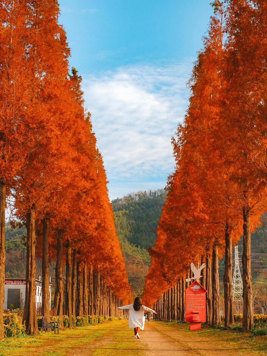 Adding to the charm of the road is a striking bright red post box installed midway, which enhances its appeal. Affectionately known as the ‘메타세콰이어 사랑의 우체통’ or ‘metasequoia mailbox of love,’ this unique feature invites visitors to express their warm affection by leaving a heartfelt message on one of the free postcards provided. It’s a clever and captivating way to capture the attention of passersby and spread love along this enchanting road.