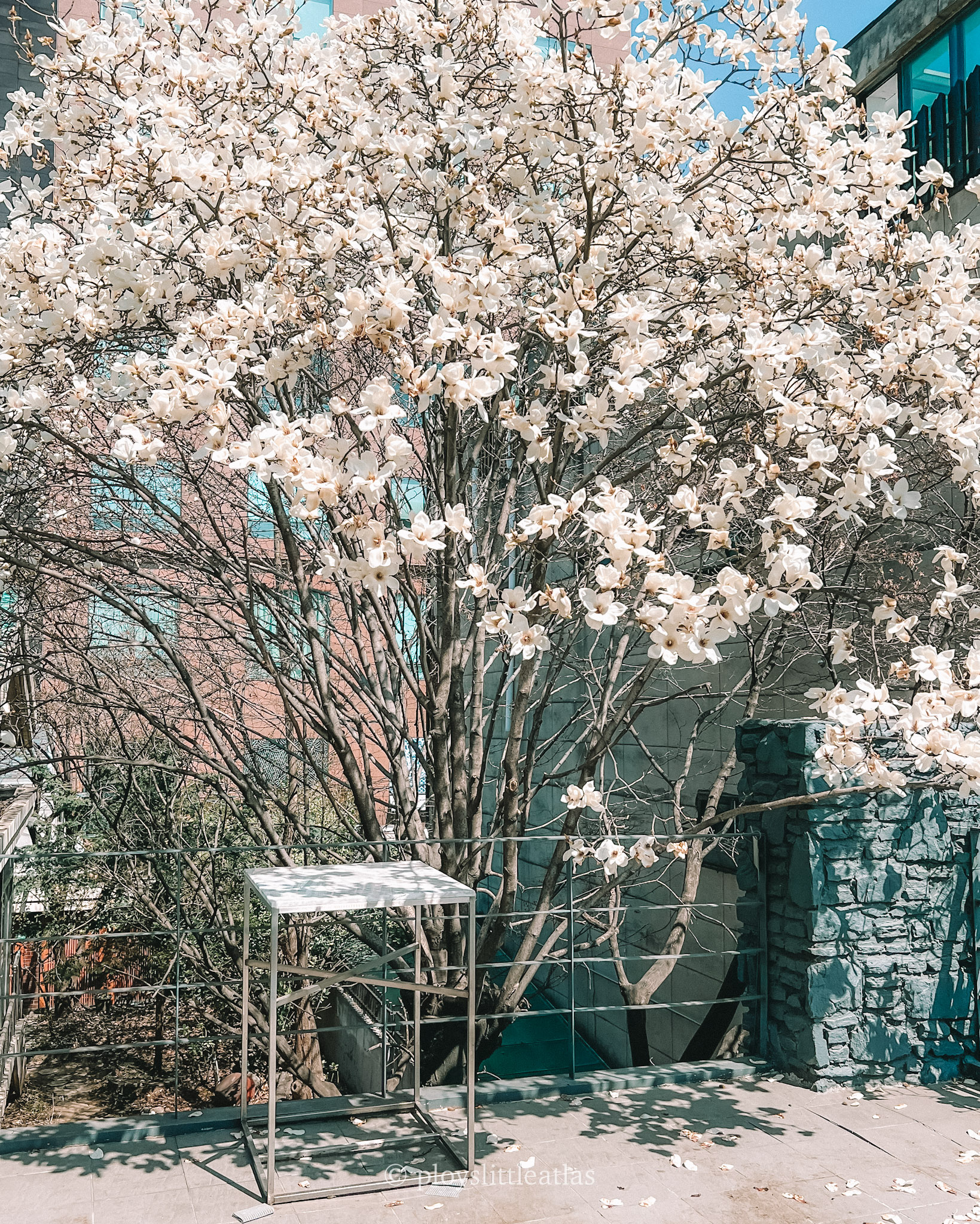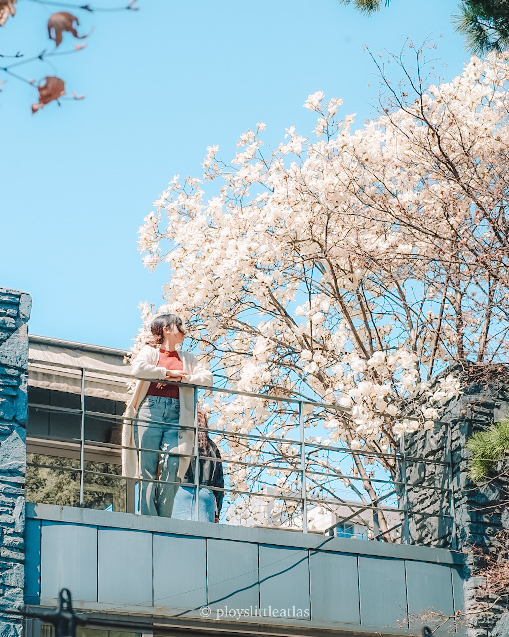 When to Go: Magnolias in Korea generally reach their peak bloom from late March to early April. I visited on March 28th and caught the white magnolia at its absolute peak, a breathtaking sight that frames the terrace perfectly.