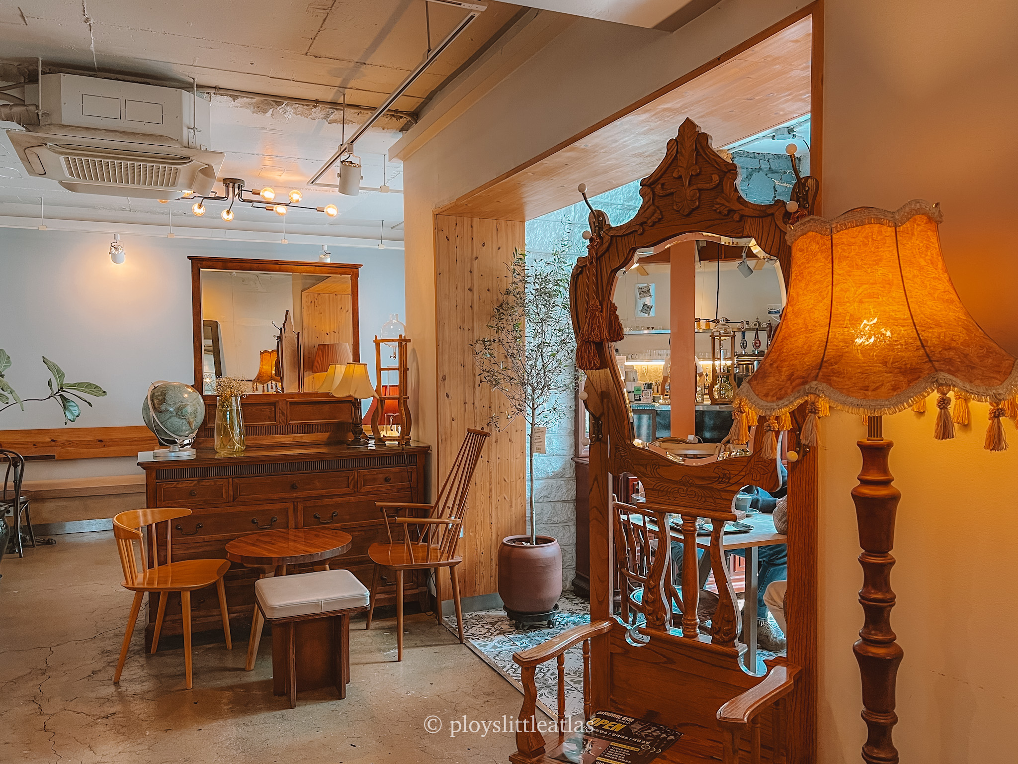 First Floor: This is where you’ll find the order counter and a tempting array of delicious-looking baked goods. The space is filled with antique wooden decor and furniture, bathed in warm lighting that creates a cozy, welcoming atmosphere. It feels like stepping into the lovely hospitality of your grandparents’ home—welcomed with a warm hug and the scent of something freshly baked.