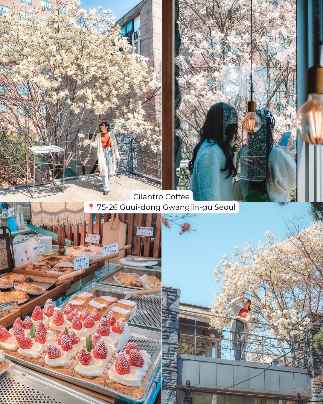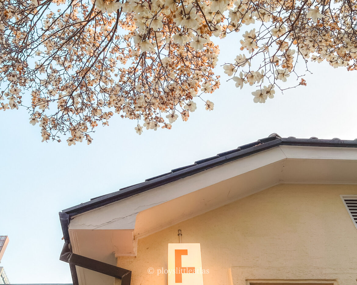 Tucked beside Seoul Children’s Grand Park, this cafe is a hidden gem. While the name suggests a focus on cilantro and vegetables (which they do use in very creative ways!), the real draw in spring is the second-floor terrace. A massive, mature magnolia tree from the neighboring house leans over the balcony, creating a natural canopy of flowers. Sitting here with a coffee under the dappled sunshine and white petals is pure magic.