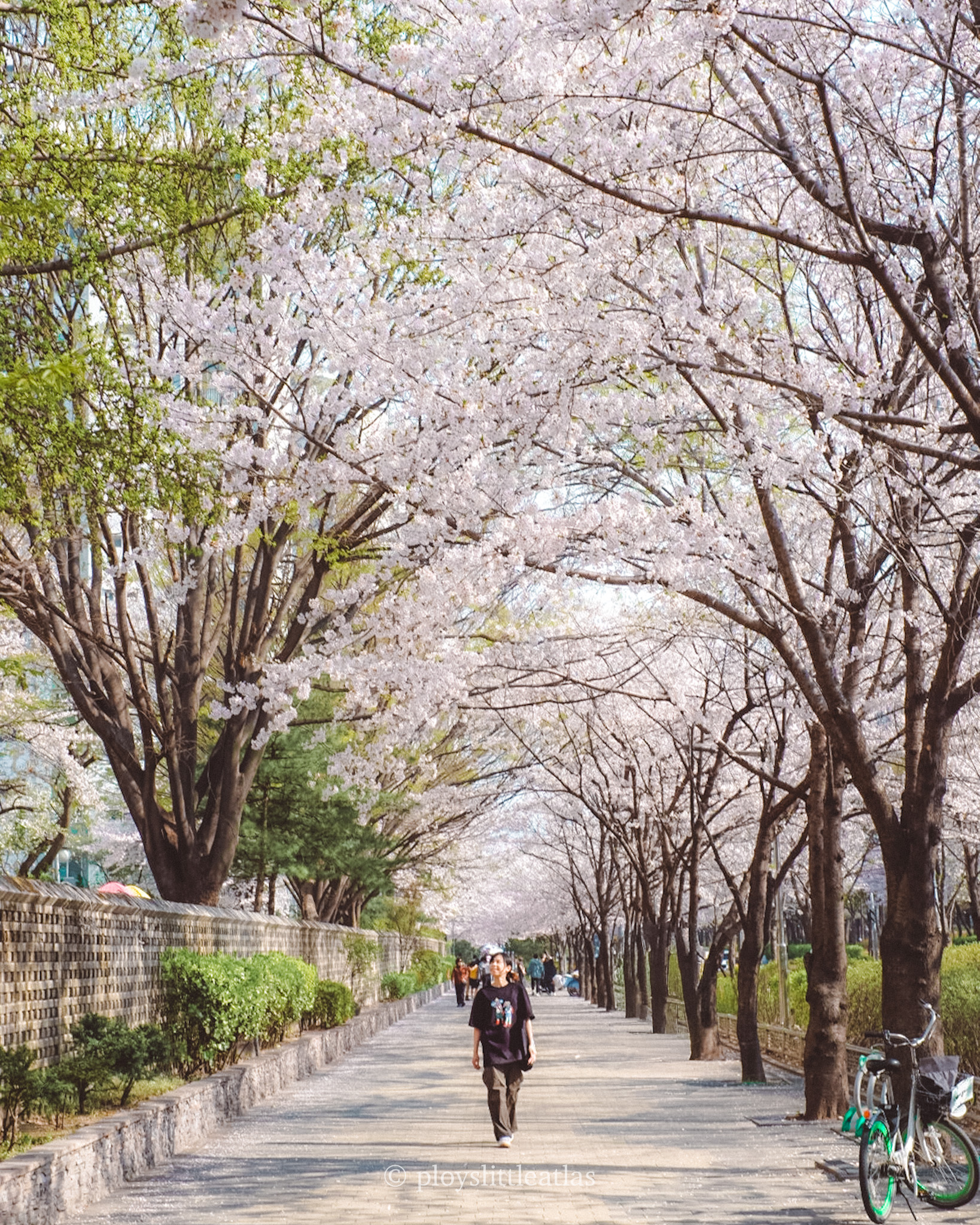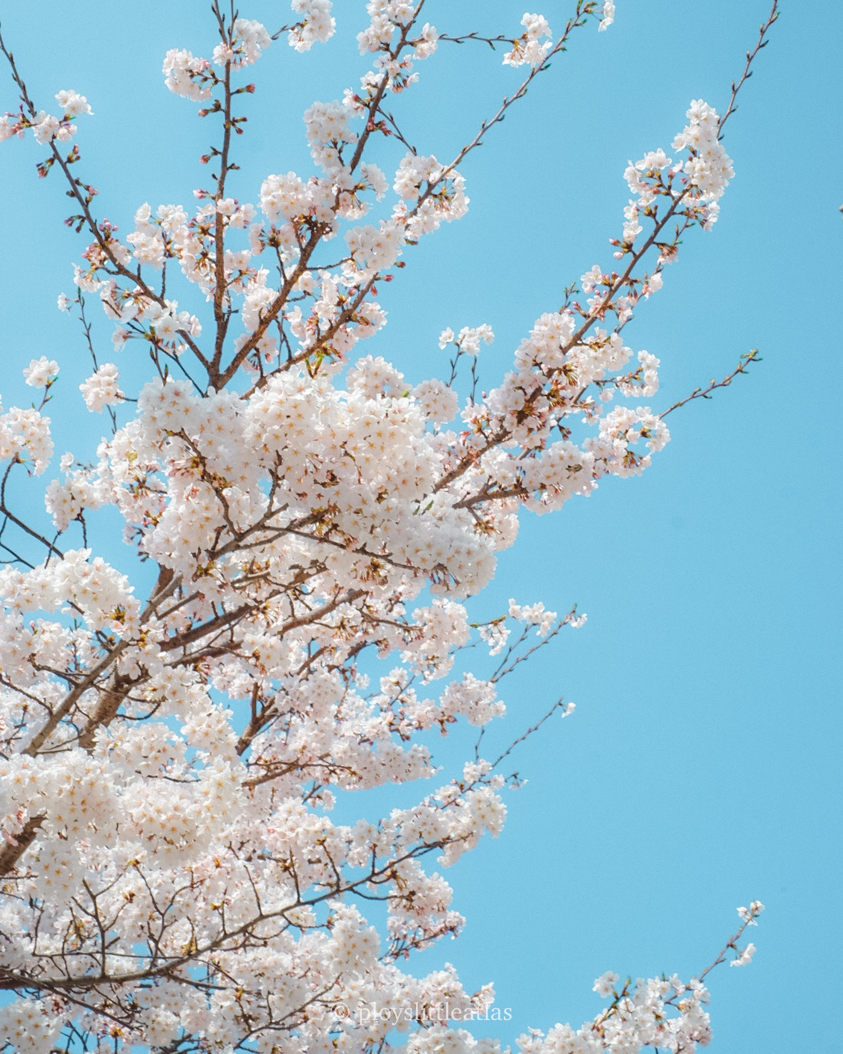 What makes Geori Park so special in the spring is the density. Because it’s a narrower “street park,” the branches from both sides often lean in toward the center, creating a natural canopy of white and pale pink petals. Walking through it felt like being showered in natural confetti every time a breeze picked up.