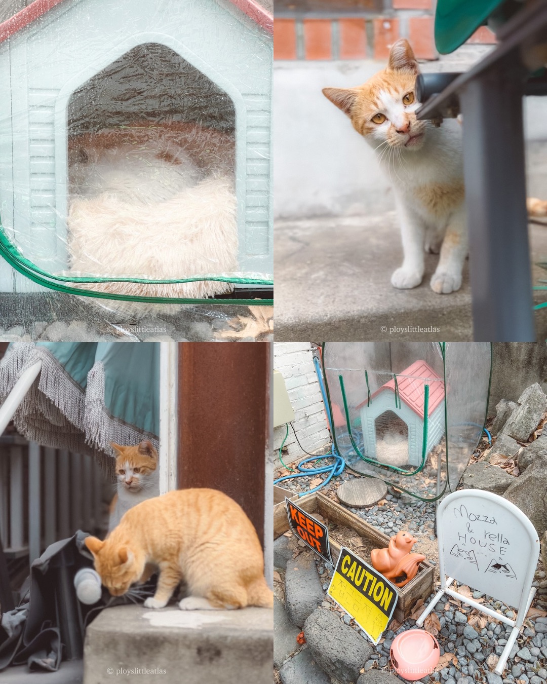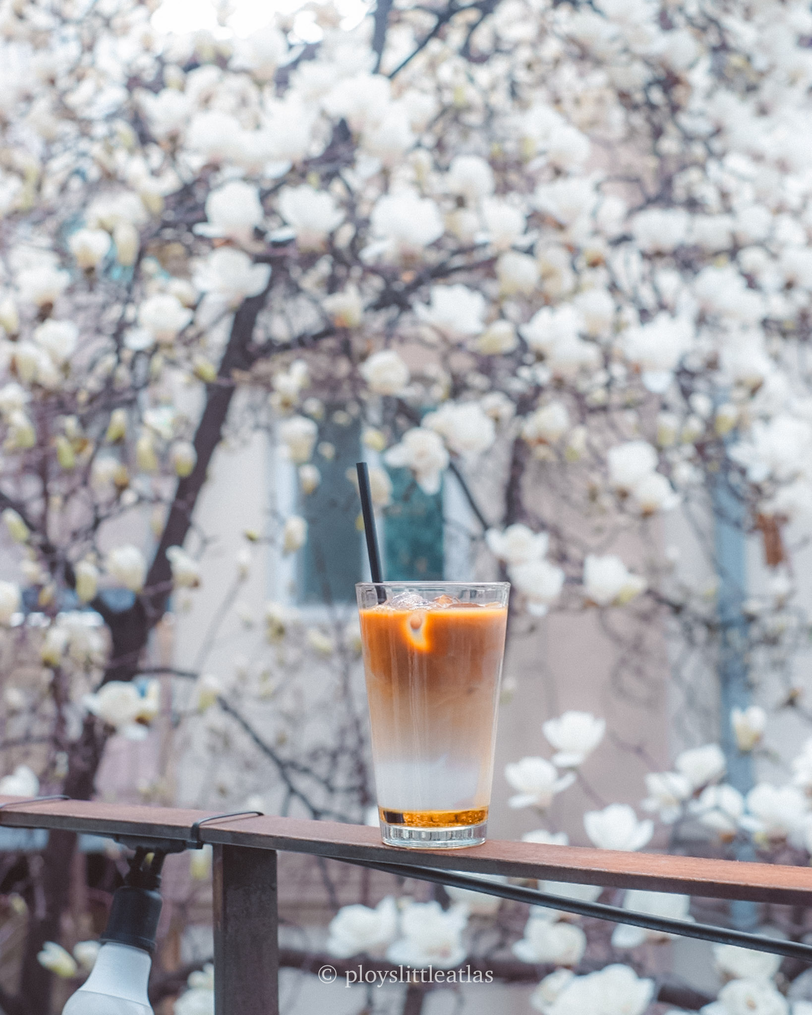 I have to confess: I almost made the magnolias the secondary reason for my visit once I learned the cafe is home to three adorable cats! There is a friendly orange tabby, a white-and-orange mix, and one that is almost entirely white. During the warmer spring days, you’ll find them running around the yard or lounging in the cute little houses the owners placed right underneath the magnolia tree.