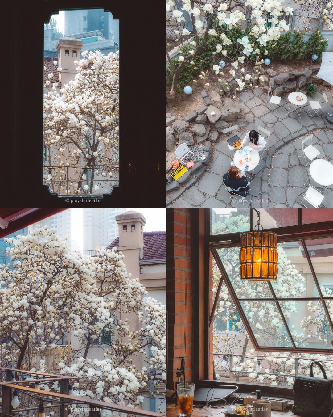 The second-floor terrace is the magical photo spot that every visitor aims for. Imagine soaking up the warm morning sunlight with a good cup of joe in your hand and a huge, blooming magnolia cloud right before your eyes. The viral photos you’ve likely seen online of cafe-goers relaxing in patio furniture underneath these floral canopies? They were taken right here.