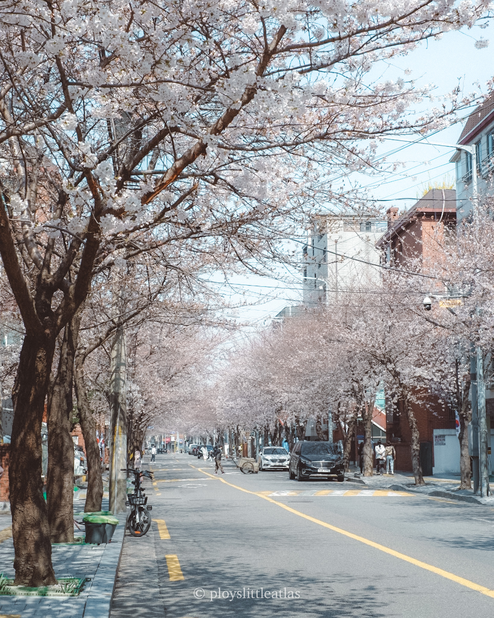 While Yeouido and Seokchon Lake draw thousands, Huiujeong-ro offers something different: serenity. This isn’t a wide boulevard or a packed park—it’s a charming residential street lined with mature cherry trees that form a near-perfect pink tunnel when in full bloom. The atmosphere is peaceful, almost neighborhood-like, where you’ll see locals walking their dogs, couples strolling hand-in-hand, and photographers calmly setting up shots without elbowing for space.