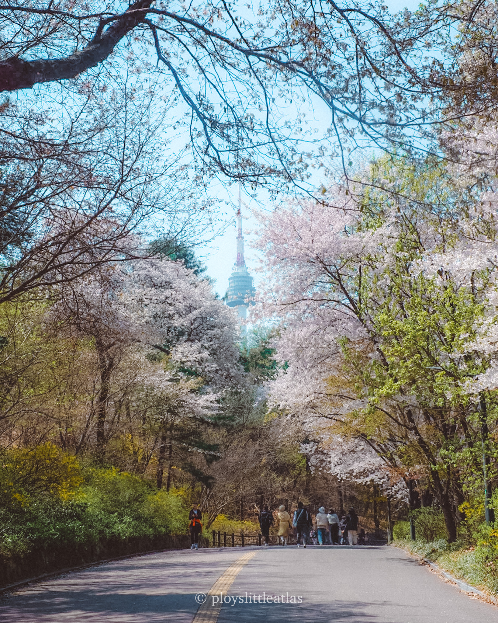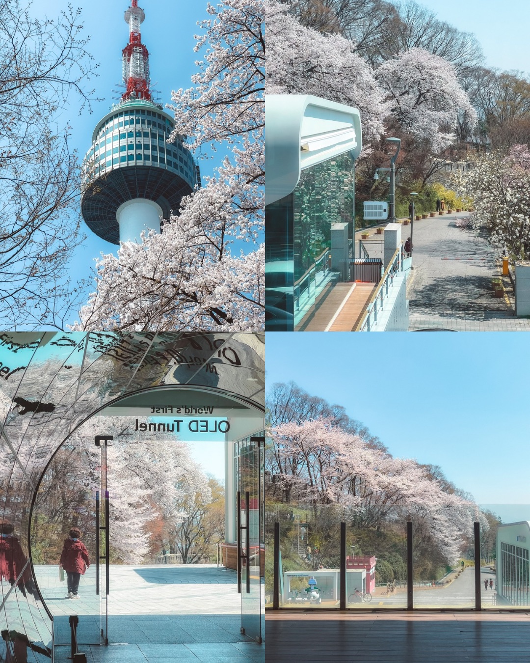 When you finally reach the beloved iconic tower, don’t just snap a selfie and leave. While there isn’t a huge cluster of cherry trees around the immediate tower plaza, there is this gorgeous group of big, mature cherry blossom trees near the Namsan Seoul Tower Hanbok Culture Center (남산서울타워 한복문화체험관) at the OLED Tunnel.