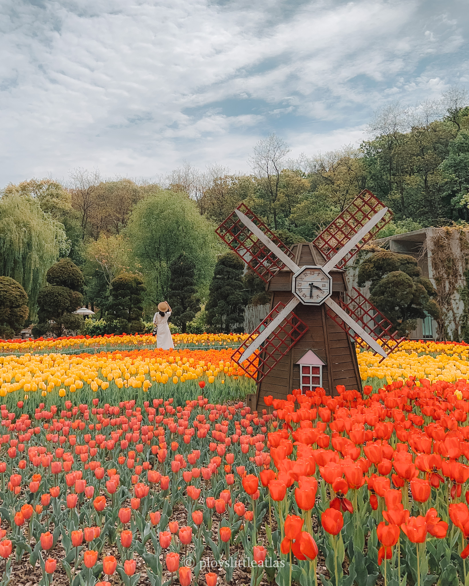 The Bucheon Mureungdo Arboretum (부천무릉도원수목원) is a haven for nature lovers and flower enthusiasts. Every spring, the arboretum transforms into a kaleidoscope of colors, with thousands of tulips painting the landscape in hues of red, yellow, pink, and purple. The tulip fields are nothing short of breathtaking, and the addition of charming European-style windmills and rustic huts makes the scenery feel like it’s straight out of a fairytale.
