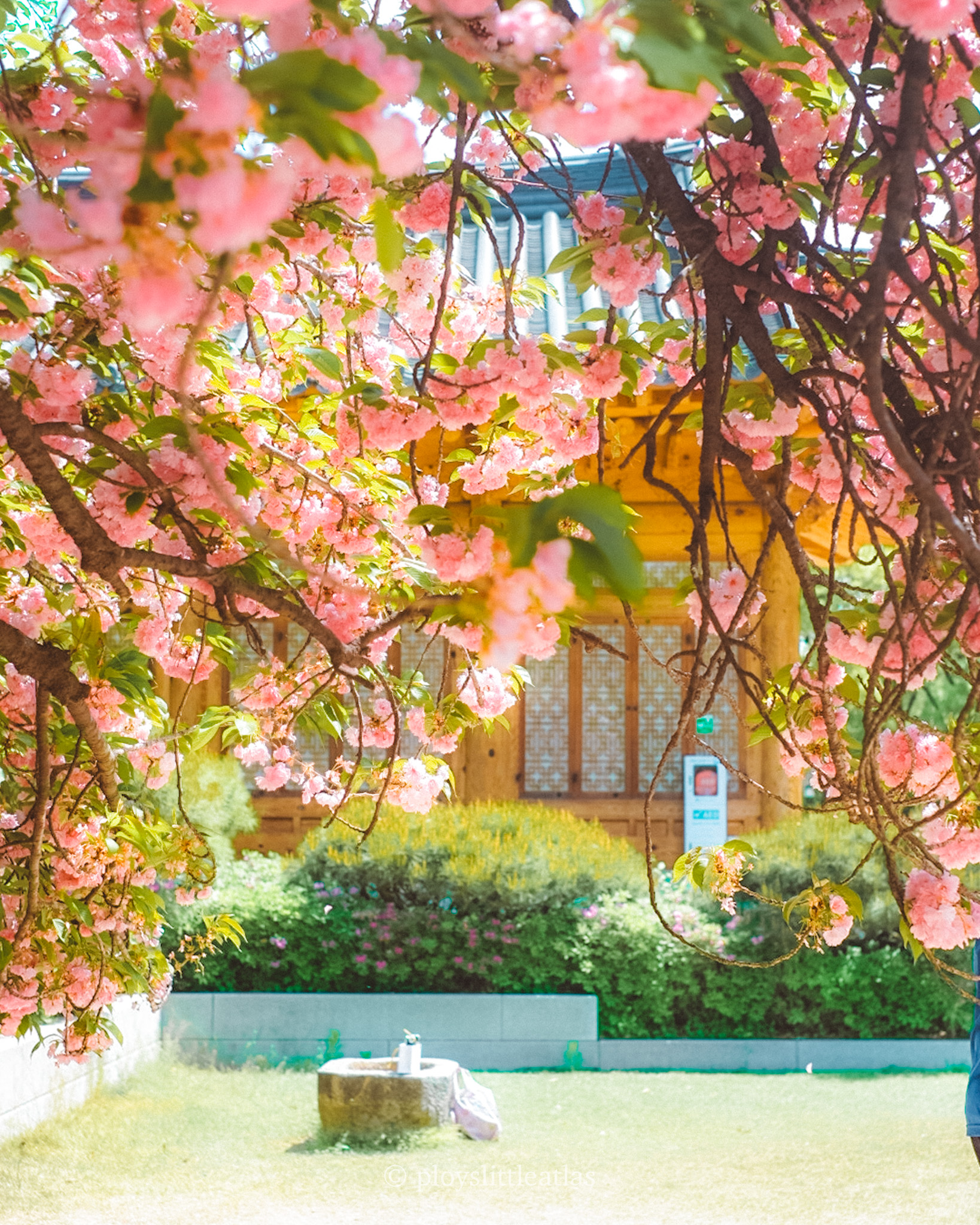 Unlike the standard single-petal blossoms that flutter away at the slightest breeze, Double Cherry Blossoms are heavy, pom-pom-like clusters. At Sarangjae (사랑재)—a beautiful traditional Hanok building used for greeting guests of the National Assembly—the contrast between the deep pink petals and the elegant tiled roofs is purely cinematic.