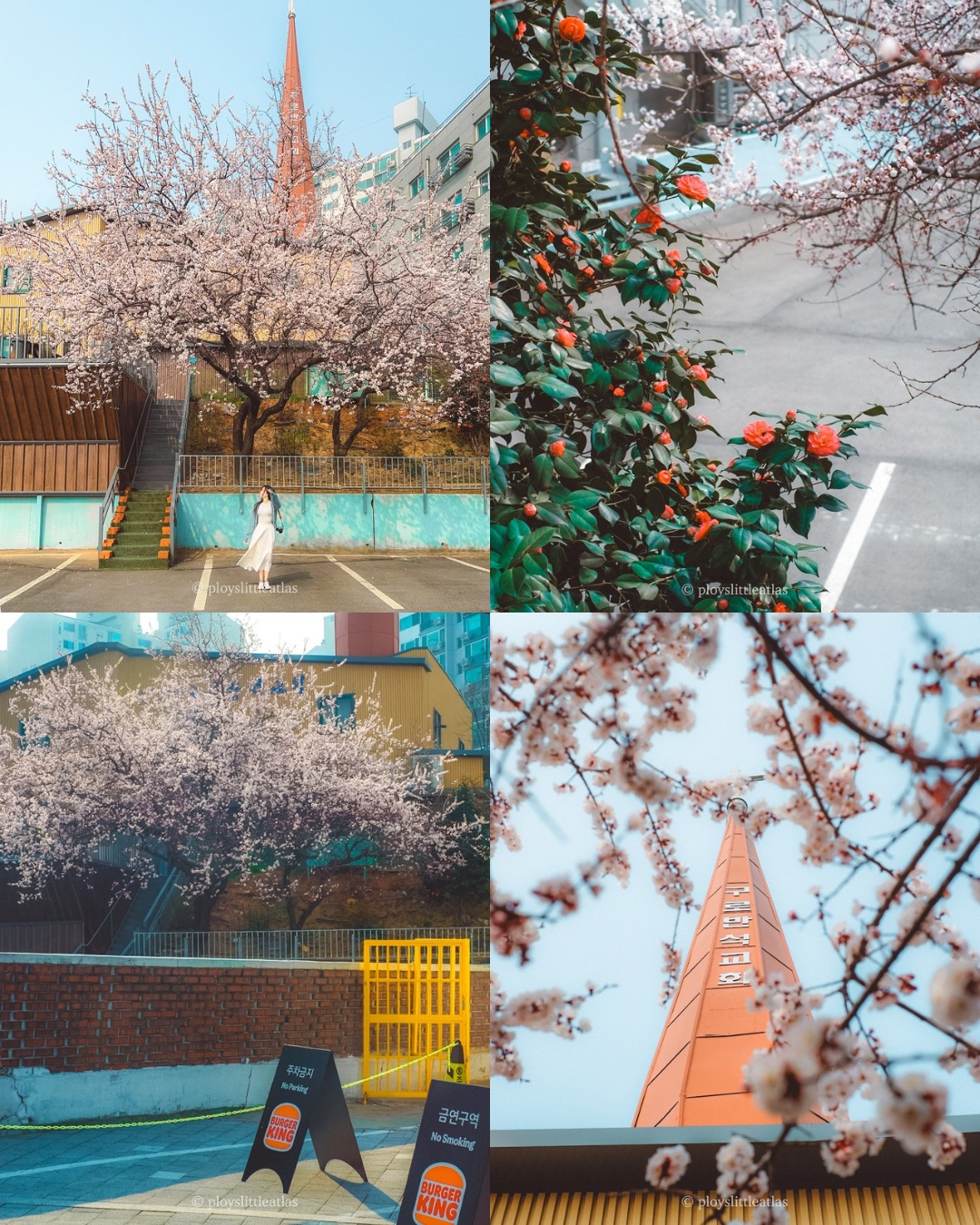 While most people head to massive public parks for their spring fix, some of the most breathtaking views are found in the quiet corners of local neighborhoods. Tucked away on the grounds of Guro Banseok Church, you’ll find a magnificent, towering plum tree that feels like a well-kept secret. This spot offers a unique urban aesthetic where the church’s bright orange spire and the surrounding modern apartment buildings provide a striking contrast to the delicate, ancient-looking branches. What makes this location truly special is the layering of colors; right at the base of the massive plum tree, you’ll find vibrant red camellia shrubs mingling within the flower beds, adding a rich, saturated pop of color to the airy white canopy above. It’s an intimate and peaceful alternative to the city’s more crowded landmarks, located just a short walk from both Guro and Sindorim stations.