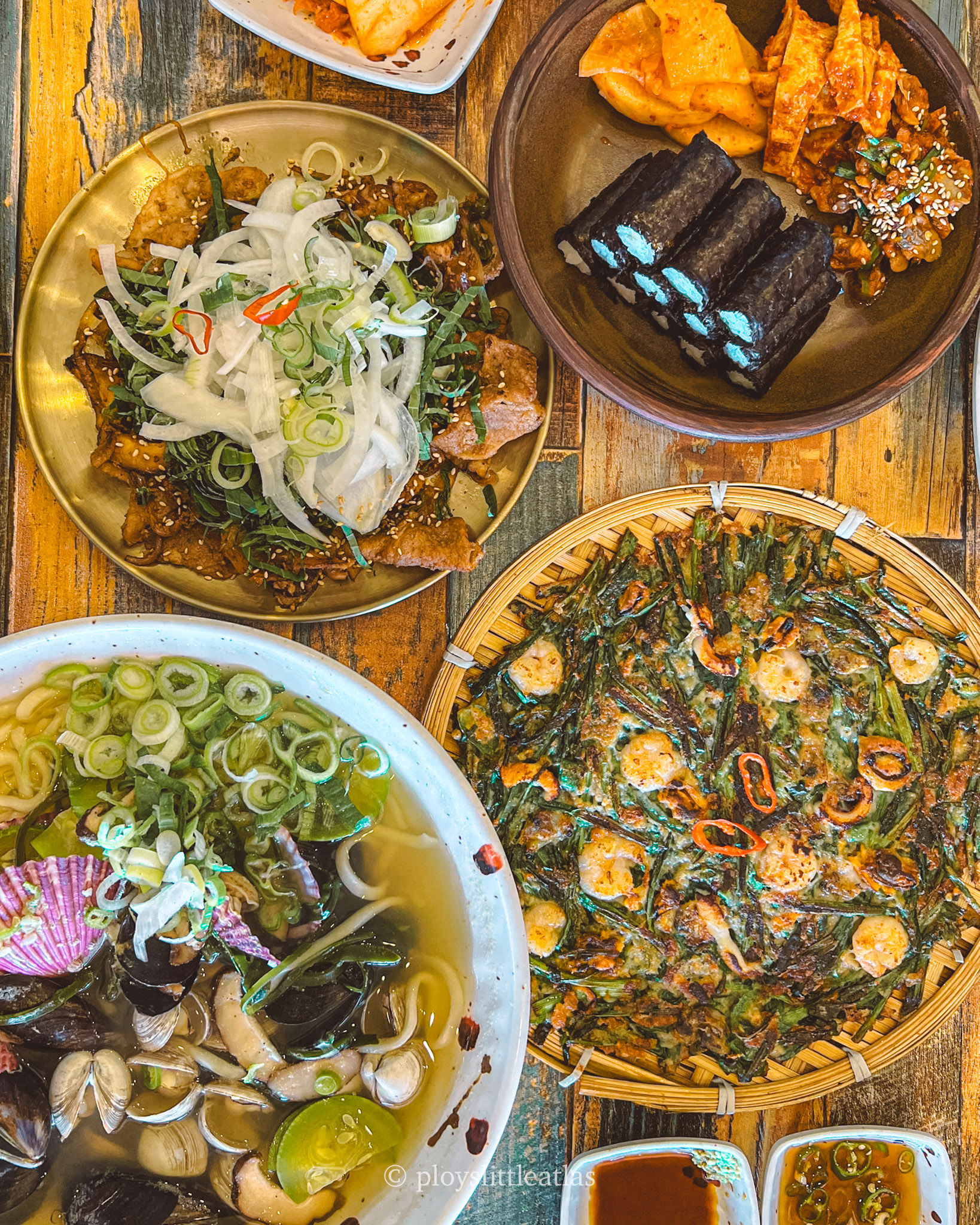 Their standout dish and a frequent favorite among diners is haemul buchujeon (해물부추전), a seafood-infused garlic chive Korean-style pancake. We thoroughly enjoyed its robust aroma and rich flavors. However, if seafood isn’t your preference, as it wasn’t for one of our fellow travelers, they also offer more traditional Korean options like dwaeji bulgogi (spicy pork barbecue) and yukhoe bibimkalguksu (spicy cold noodle salad).